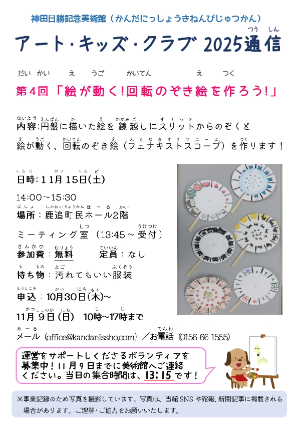 鹿追町内の小学生を対象とした鑑賞と工作のワークショップ「アート・キッズ・クラブ」の第4回を11月15日(土)に開催します!円盤に描いた絵を鏡越しにスリットからのぞくと絵が動く、回転のぞき絵(「フェナキストスコープ」)を作ります。皆さんのご参加、お待ちしています!