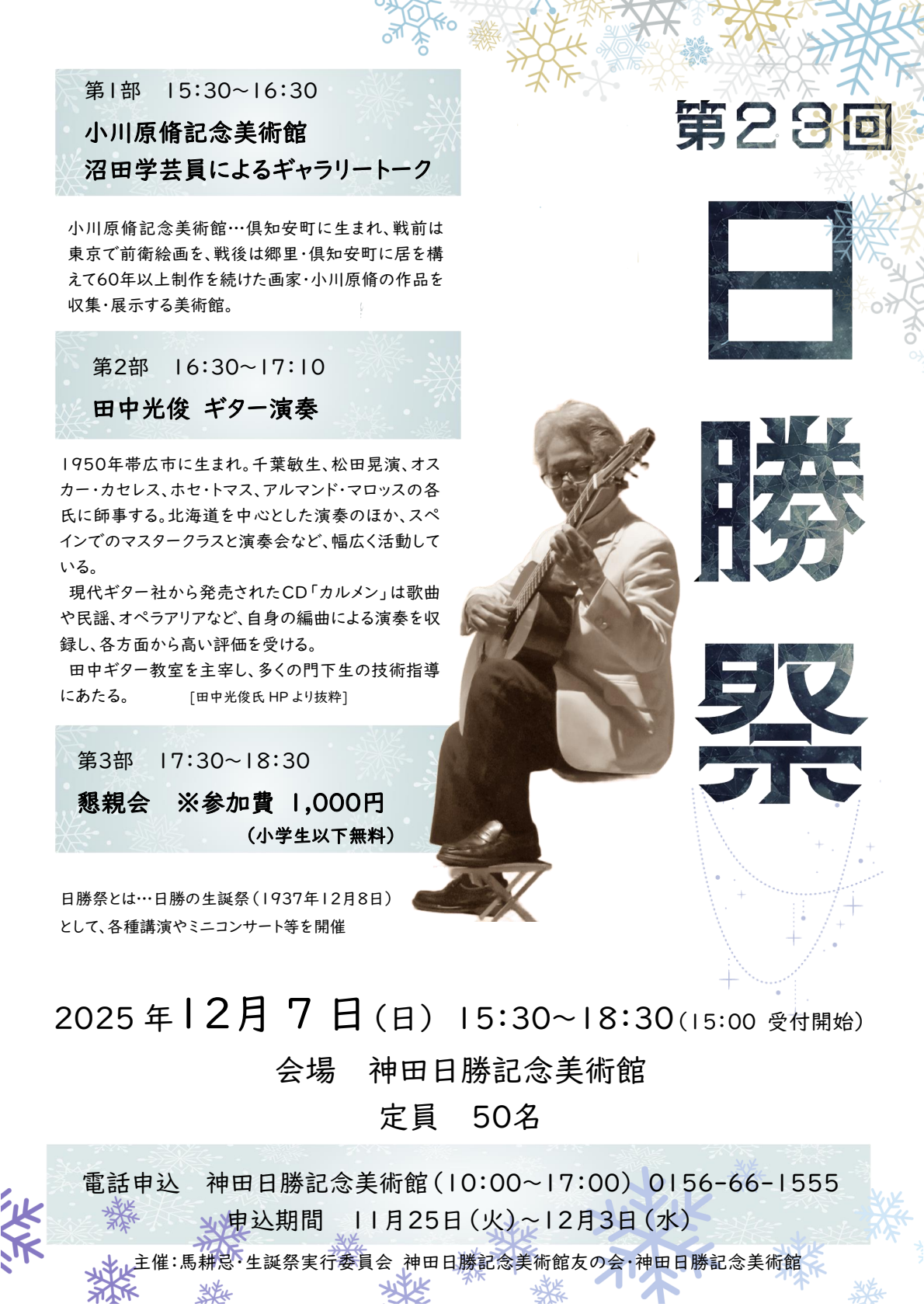 今回の日勝祭では、ただいま開催中の特別企画展「神田日勝記念美術館×小川原脩記念美術館所蔵作品交換展 二人の歩んだ道」より、作品貸出館の小川原脩記念美術館の副館長(学芸員)の沼田絵美さんによる特別ギャラリートーク、またクラシックギタリストの田中光俊さんによるギター演奏、さらに懇親会の開催を予定しております。